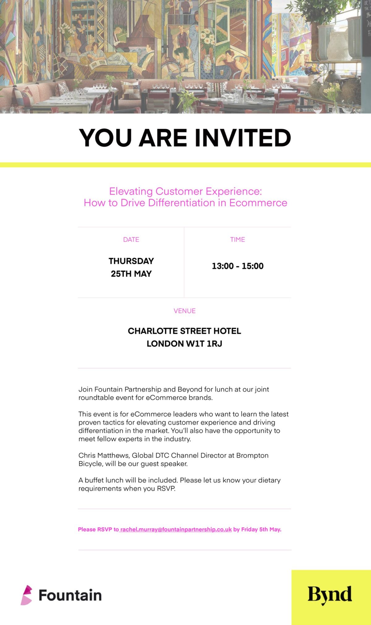 Our guest speaker is Chris Matthews, Global DTC Channel Director at Brompton Bicycle! Places are limited, so for full details and to reserve your spot, get in touch and RSVP to rachel.murray@fountainpartnership.co.uk. Can’t make that date? We have lots more events coming up, so do get in touch to find out more!