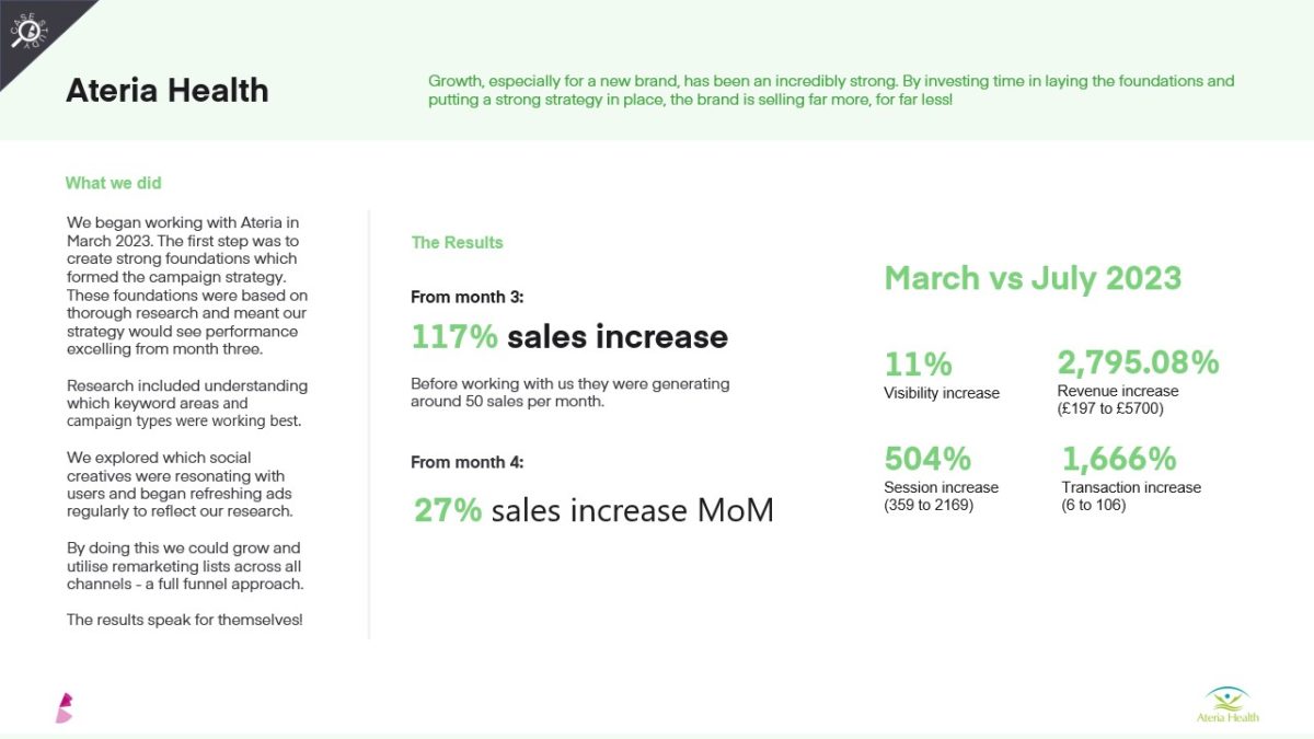 We began working with Ateria in March 2023. The first step was to create strong foundations which formed the campaign strategy. These foundations were based on thorough research and meant our strategy would see performance excelling from month three.