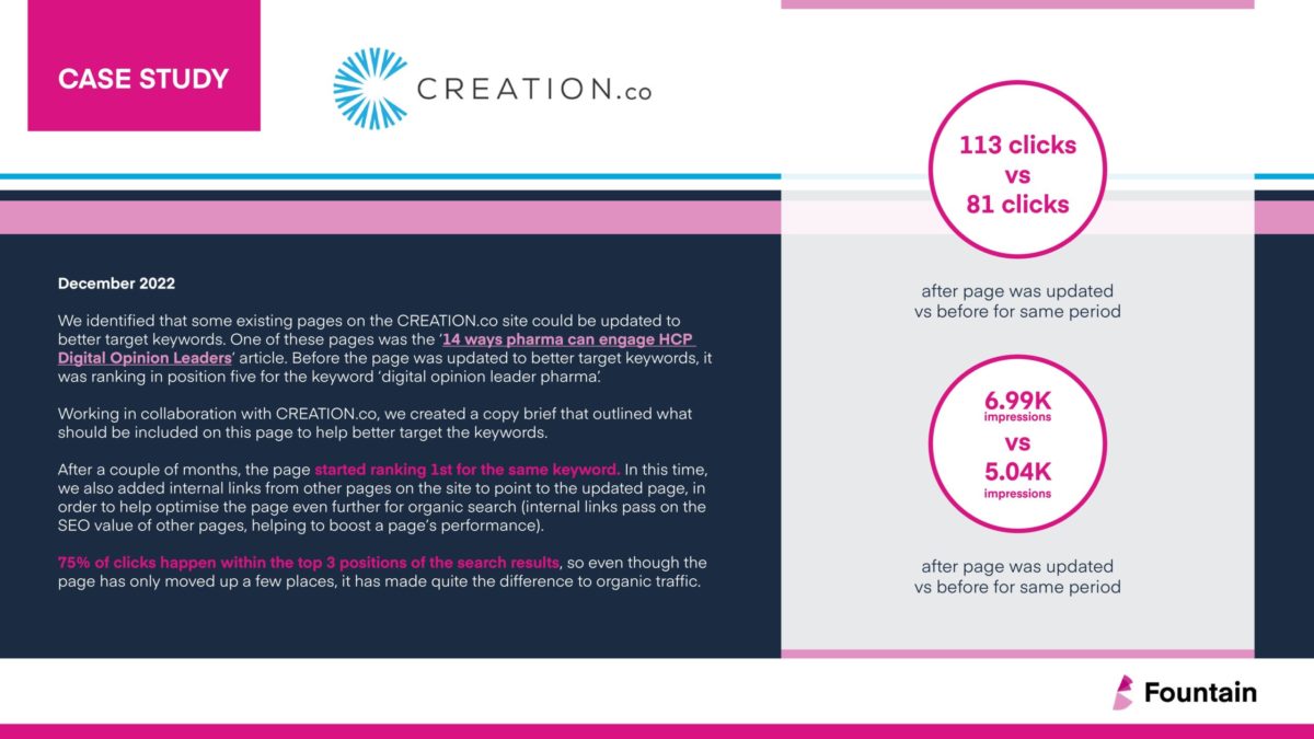 Working in collaboration with CREATION.co, we created a copy brief that outlined what should be included on their ‘14 ways Pharma can engage HCPs‘ page to help better target the keywords.