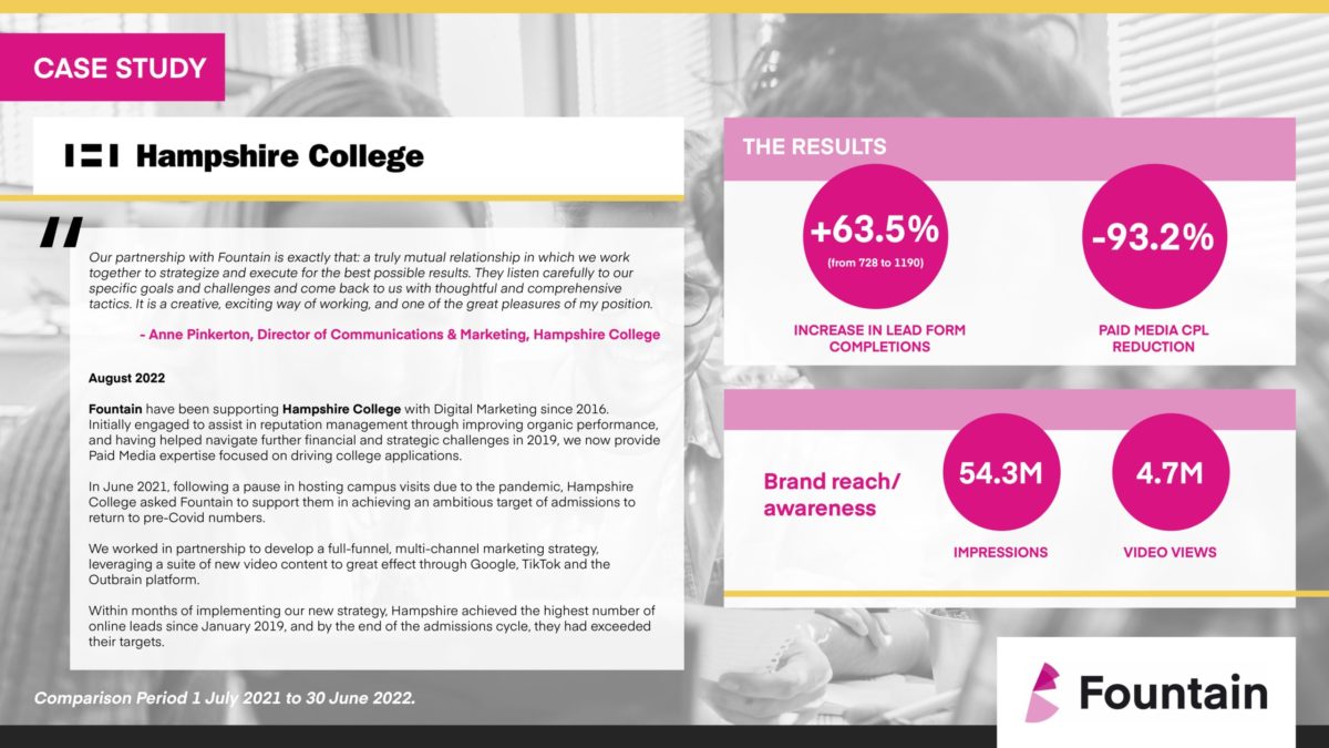 In June 2021, following a pause in hosting campus visits due to the pandemic, Hampshire College asked Fountain to support them in achieving an ambitious target of admissions to return to pre-Covid numbers.