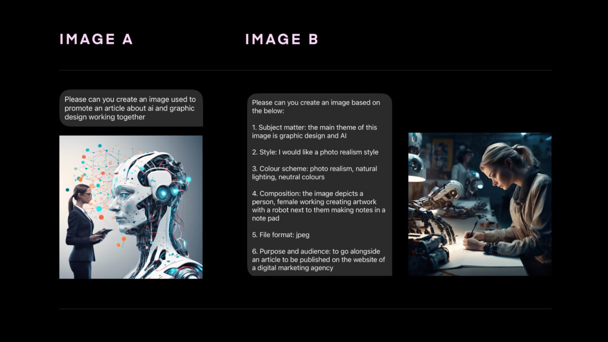 An example of this was when I looked to ChatGPT to create an image for this article. With the basic information put in, and no artistic direction, this image was the result (Image A). I then went back to input more information including subject, Style, Colour, Composition, Format and Purpose. The results (Image B) though not perfect, more effective.