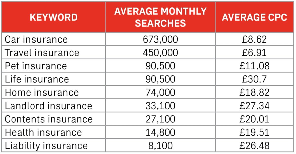 Google Ads’ cost-per-clicks for the insurance and finance industries are well known to be high, the below sample of popular insurance keywords have an average CPC of £18.83.