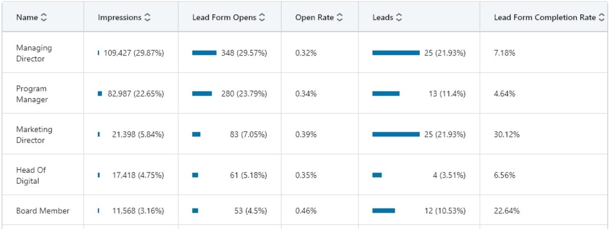 This screenshot demonstrates the performance differences nicely. In this situation, the volume of leads from Program Managers still makes up a good chunk of the total leads, so you might start thinking about the value of the leads from Program Managers vs the value of those from Marketing Directors. Marketing Directors are over six times more likely to complete the form after opening it. But perhaps Program Managers are more important to the advertiser?