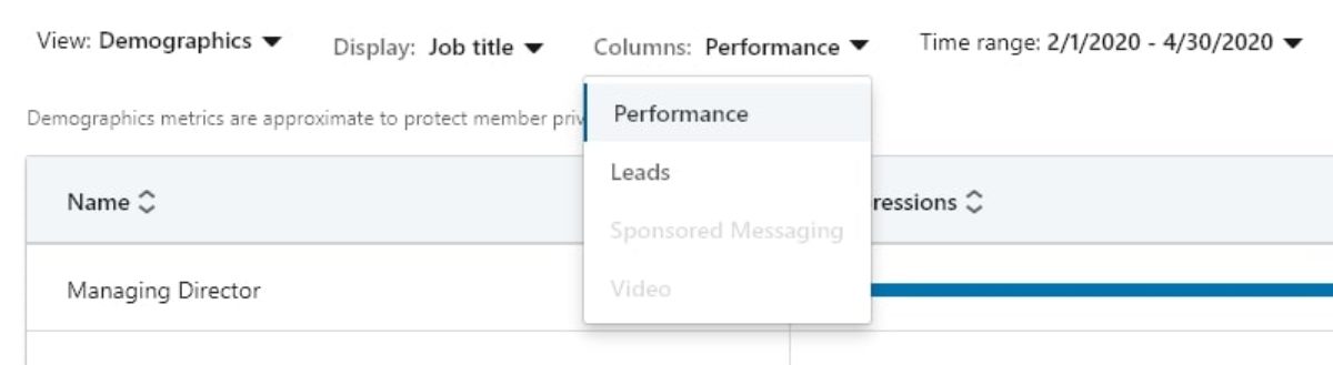 For campaigns with other goals, you could compare demographics by the engagement of your videos or your sponsored InMail. This is particularly useful when you are paying by CPM, CPV or CPS and you want to reach the most engaged audience possible.