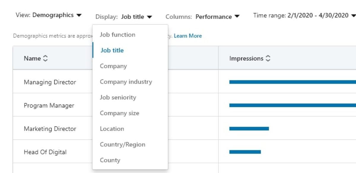 Demographic reports also mean that you can share additional information with marketing managers, thus adding more value. You could share how many times people from particularly companies saw your ads, as well as the most engaged users by job title. This could then contribute to the wider marketing strategy including content, language, tone of voice, and even business growth opportunities.